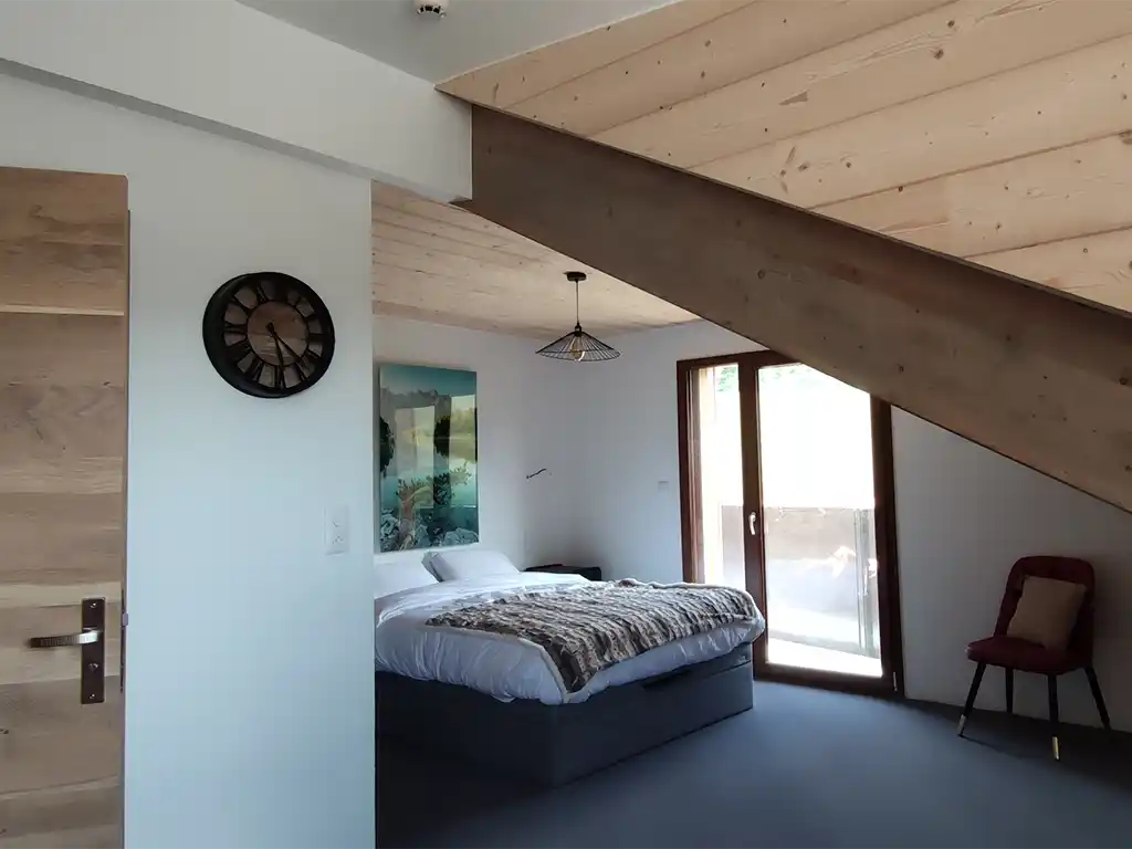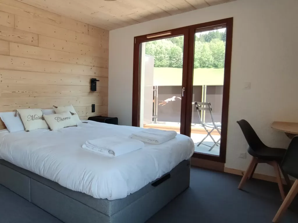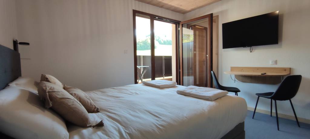 L' APPART DUO BALCON est équipé d'un lit double 160x200, d'une cuisine, d'une salle d'eau et d'un balcon offrant une vue sur la nature environnante et la montagne du Mont d'Or.