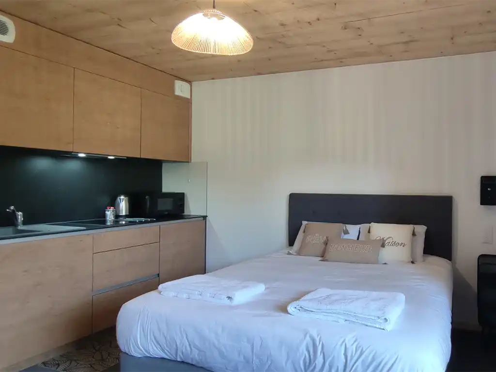 L' APPART DUO est équipé d'un lit double 160x200, d'une cuisine et d'une salle d'eau.