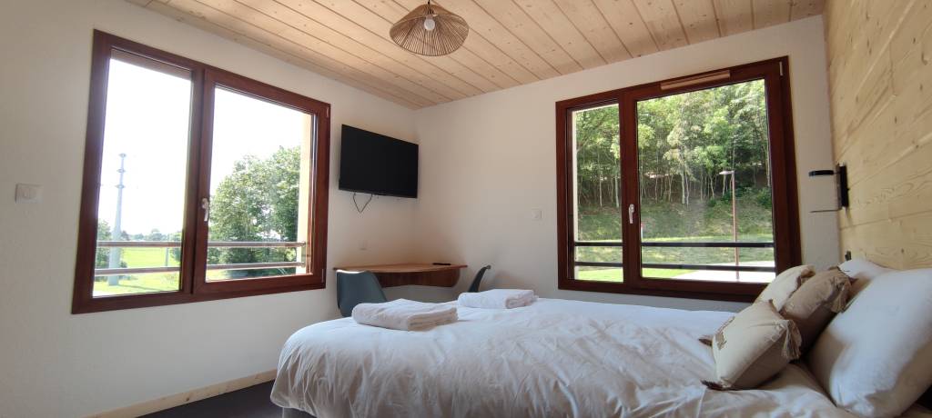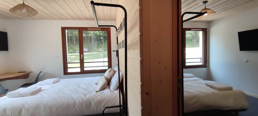 La chambre familiale est équipée d'un lit double, de deux lits superposés dont l'un des deux est modulable en deux lits simples.