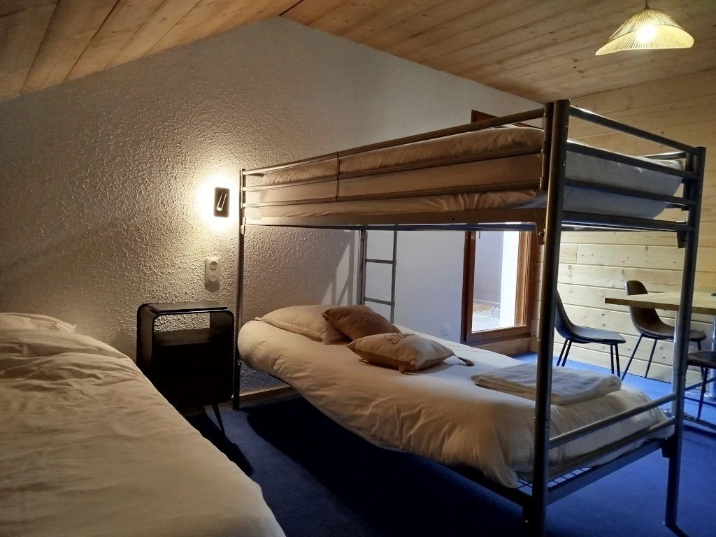 La chambre familiale est équipée d'un lit double, de deux lits superposés dont l'un des deux est modulable en deux lits simples.