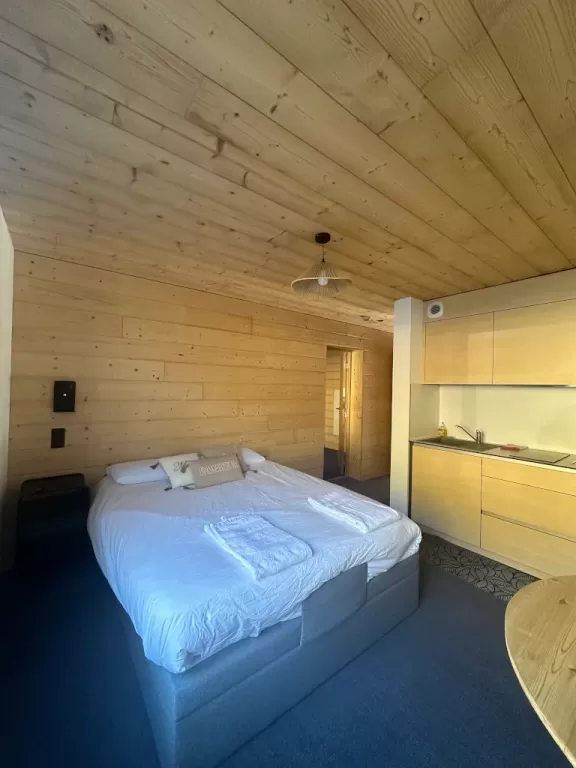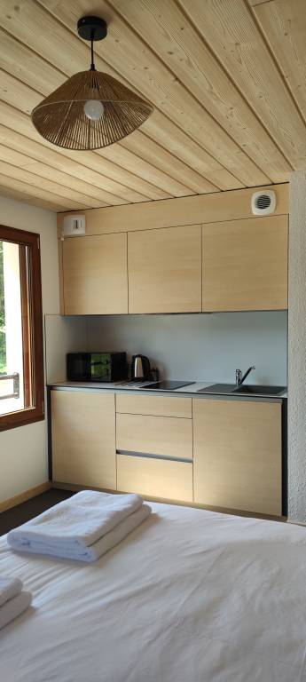 L' APPART DUO est équipé d'un lit double 160x200, d'une cuisine et d'une salle d'eau.