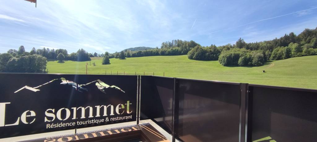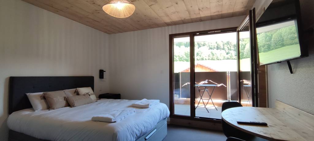 L' APPART DUO BALCON est équipé d'un lit double 160x200, d'une cuisine, d'une salle d'eau et d'un balcon offrant une vue sur la nature environnante et la montagne du Mont d'Or.