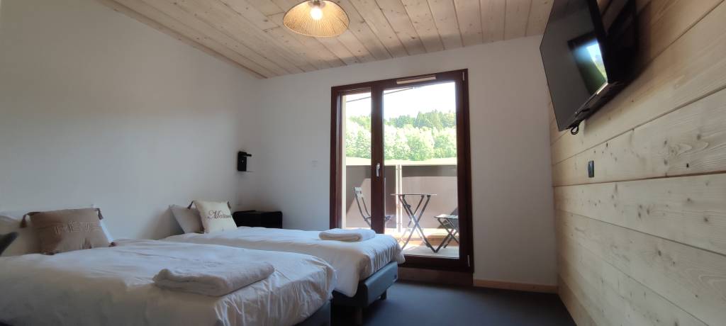 Chacune disposant de sa propre entrée, salle de bain privée, télévision et d'un balcon avec vue sur les montagnes du Jura.